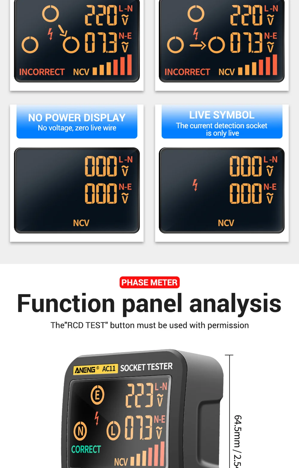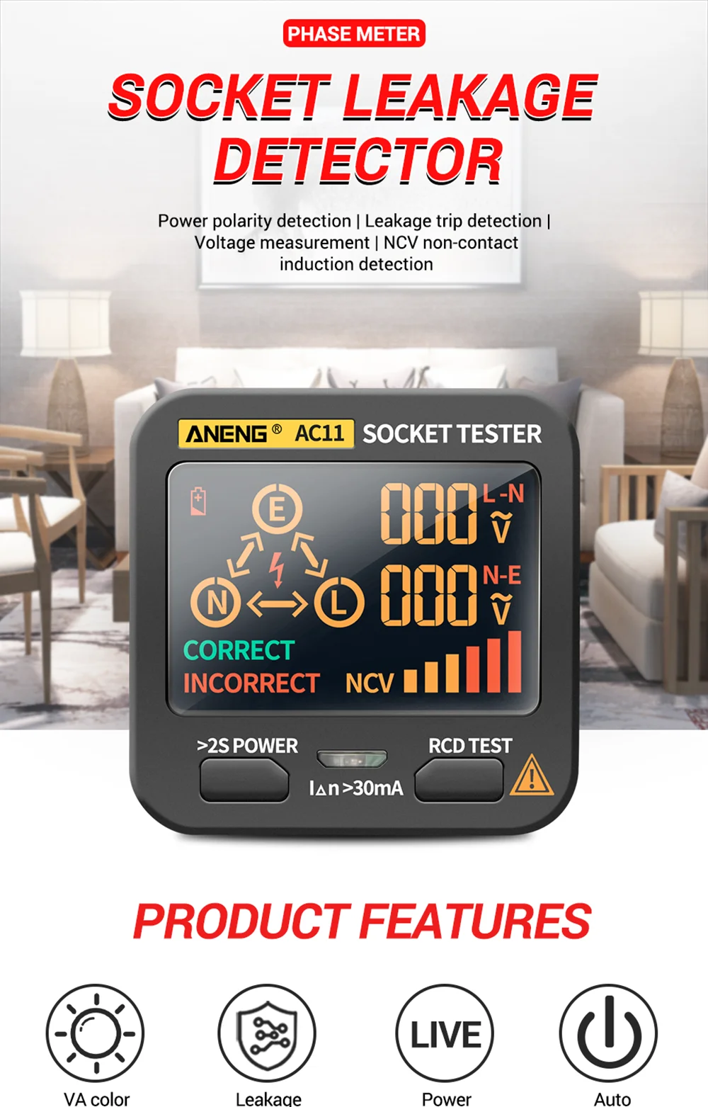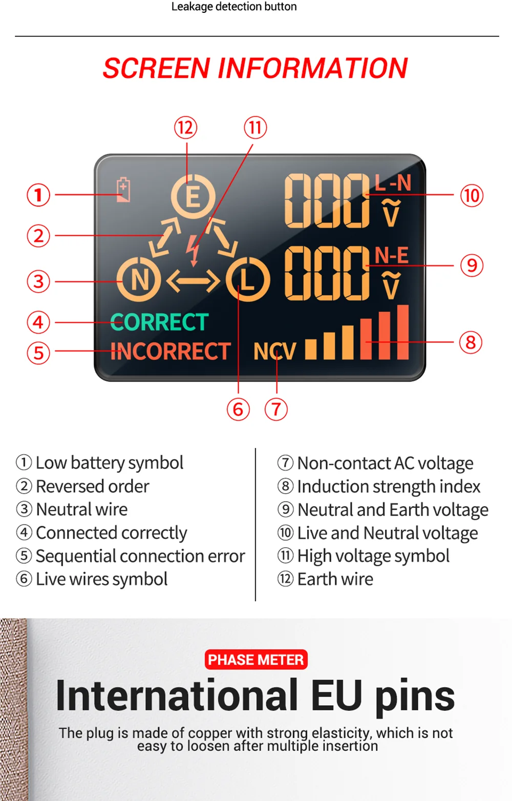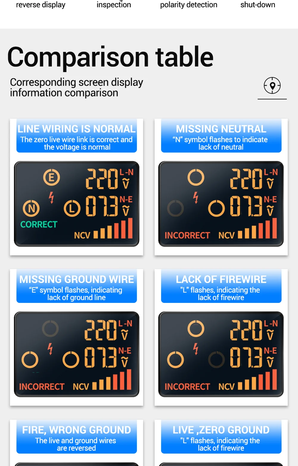 It can quickly and accurately detect the connection status of the socket at the same time:Includes 7 different patterns for you to read:Correct / Ground Open / Neutral Open / Live/NEU Reverse / Live/GRD Reverse / Live Open / Live Ground Reverse Missing Ground.