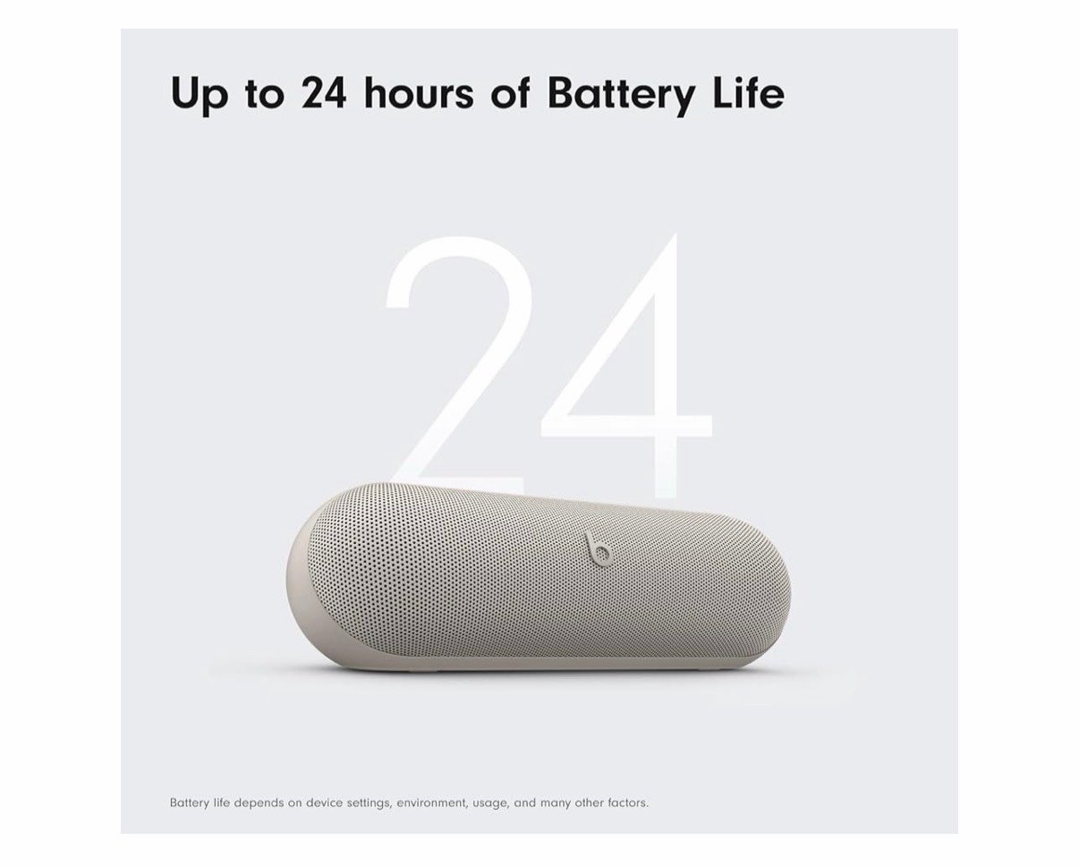 The Beats Pill has up to 24 hours of battery life for all-day playback and can be used to charge your phone or other devices via USB-C cable.