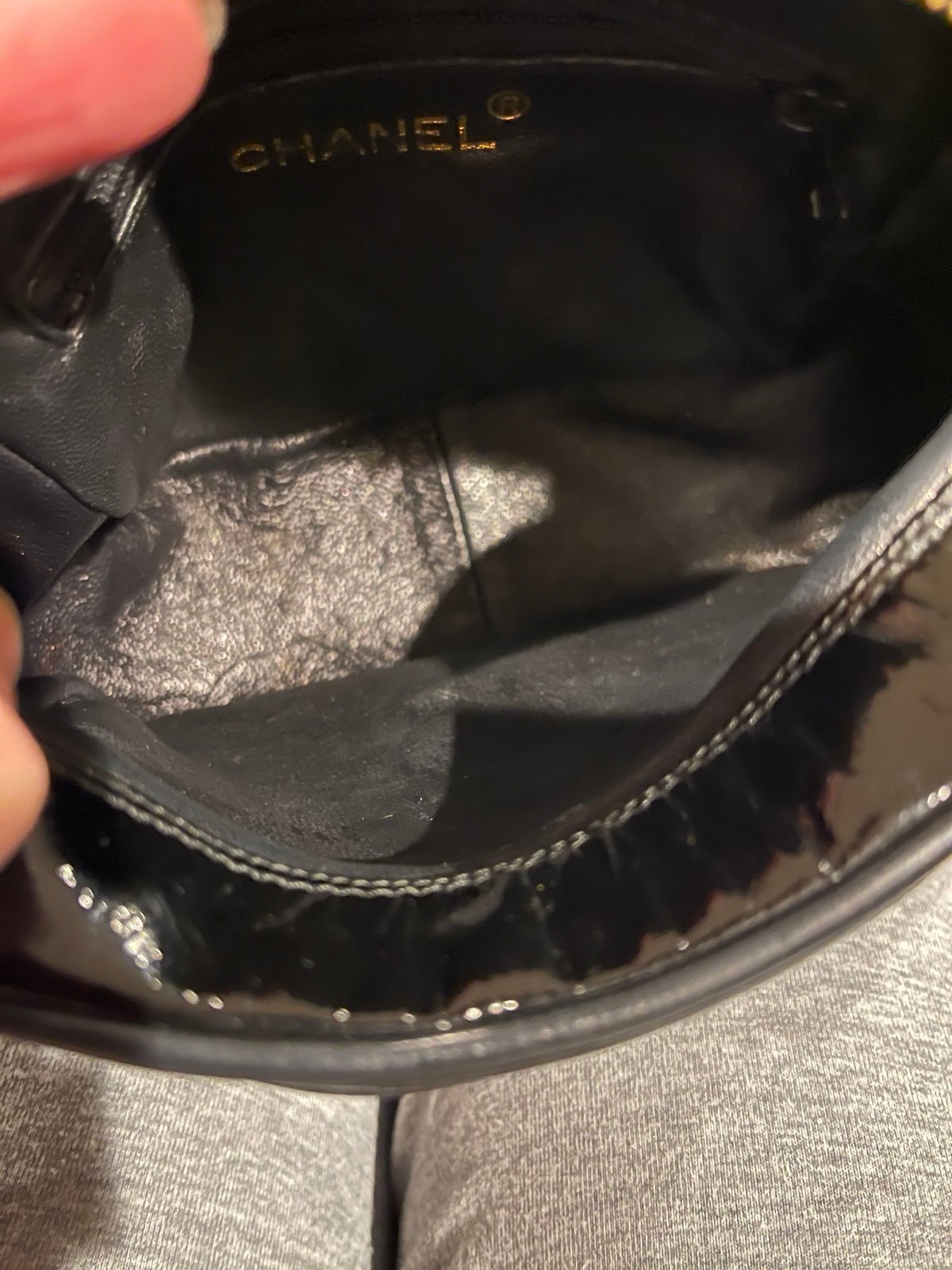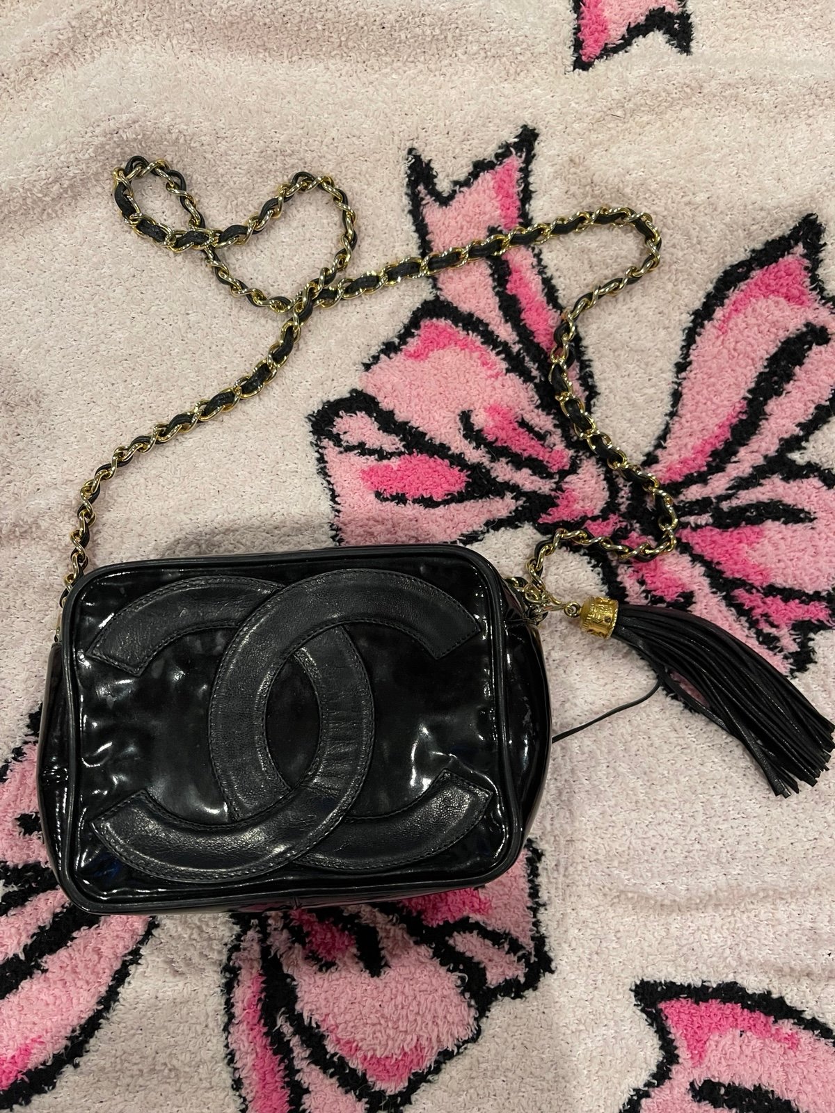 The purse is a small Chanel CC patent leather tassel camera bag with a chain 19” gold chain. It has a solid black exterior with gold hardware accents! 5”x7”. It’s in good used condition as it has been taken care of! It’s authentic!