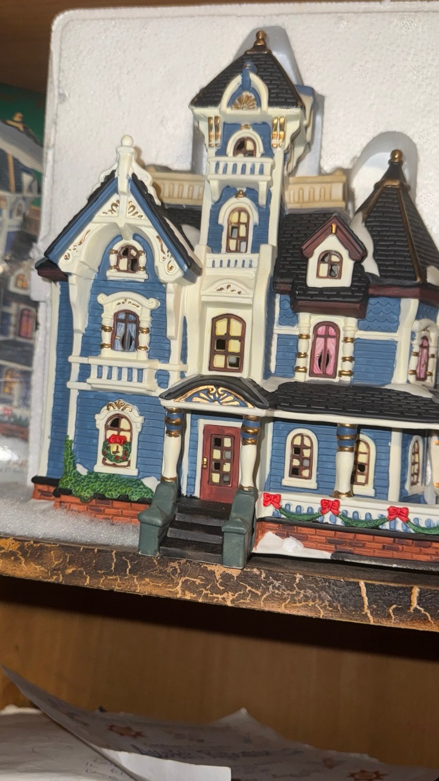 The Heartland Valley Village Deluxe Porcelain Large Blue House is a beautifully crafted Victorian-style village house suitable for floor train display or on furniture display. Hand-painted with a beautiful blue finish, this illuminated house is a limited edition piece from the 21st century. Perfect for Christmas and seasonal occasions, this collectible item is a charming addition to any room. Made of porcelain and in excellent used condition, this house is a unique and festive find for collectors and enthusiasts of holiday and seasonal decor. box included.