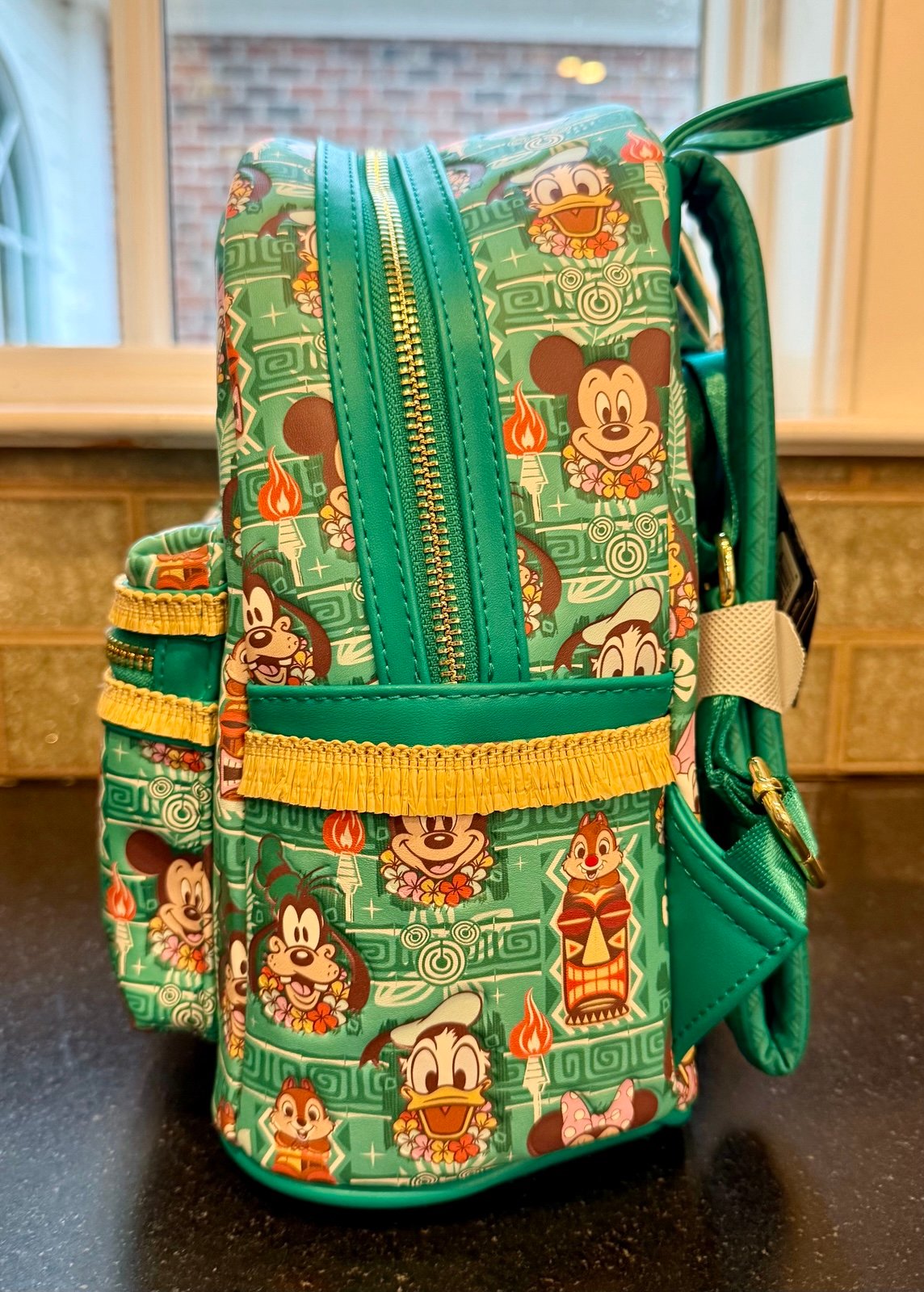 Celebrate fun adventures with the Grotto Treasures Exclusive Loungefly Disney Mickey and Friends Tiki Mini Backpack and Wallet. This expertly crafted mini backpack showcases a vibrant Tiki-inspired print featuring Mickey, Minnie, Donald, Daisy, Goofy, Chip, Dale and Pluto. The front pouch is accented with a golden Mickey silhouette zipper charm, adding a touch of classic Disney charm. Compact yet spacious enough for your essentials, this backpack is perfect for Disney fans looking to combine style and functionality on their sunny escapades.