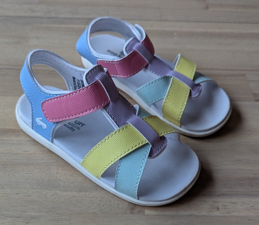 Bright and fun sandals perfect for kids. Features a vibrant mix of pink, blue, and yellow colors. Comfortable and stylish for everyday wear.